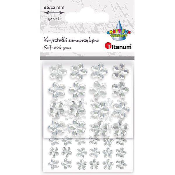 Kryształki samoprzylepne kwiaty O11/9/8/6mm 48szt.Kryształki samoprzylepne, wzór: kwiaty, średnica: 11/9/86 mm. 48 sztuk. |