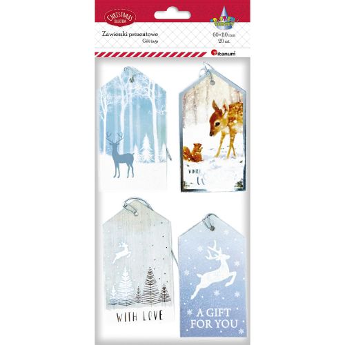 Zawieszki do prezentów wykonane z kartonu. W każdej zawieszce jest wycięty otwór na dowieszenie sznureczka. Tylna strona zawieszki nie posiada nadruku. Do każdej zawieszki dołączona jest ozdobna koperta do kompletu.