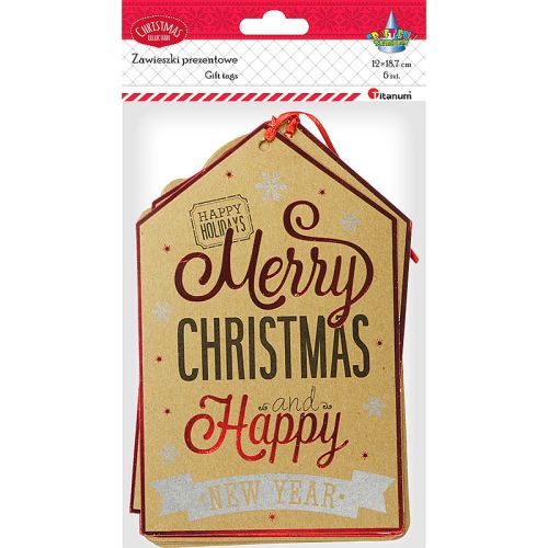 Zawieszki do prezentów wykonane z kartonu. W każdej zawieszce jest wycięty otwór na dowieszenie sznureczka. Tylna strona zawieszki nie posiada nadruku.