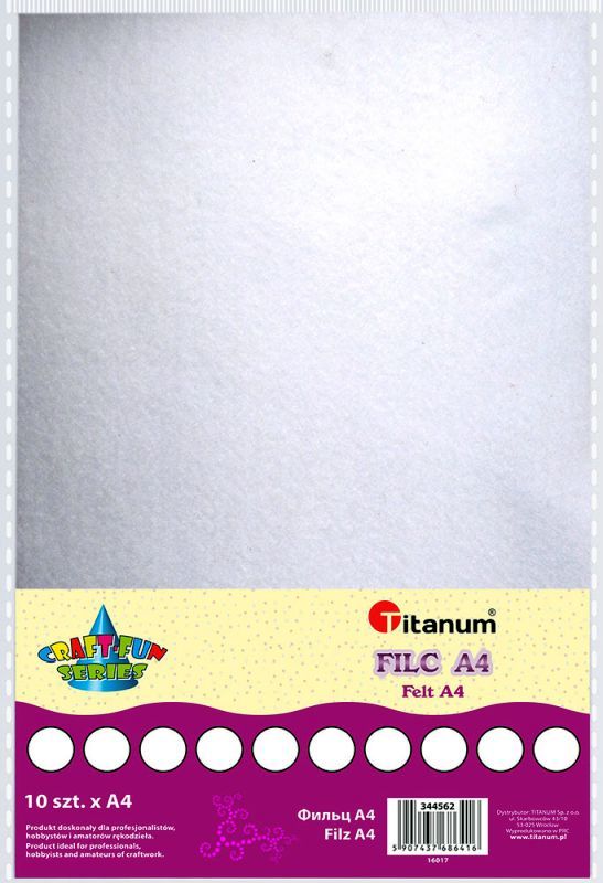 Filc A4 2mm 200g 10szt. biały Filc dekoracyjny. Format: A4. Grubość: 2 mm, gramatura: 200 g. Kolor: biały. |