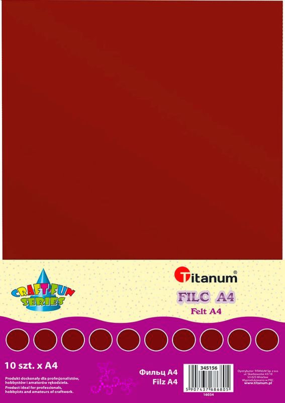 Filc A4 2mm 200g 10szt. czekoladowy Filc dekoracyjny. Format: A4. Grubość: 2 mm, gramatura: 200 g. Kolor: czekoladowy. |