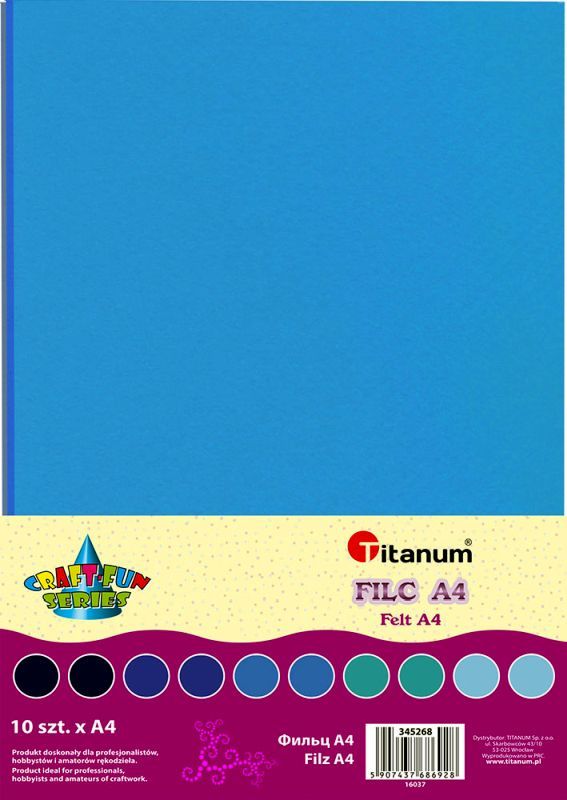 Filc A4 2mm 200g 10szt. 2x granatowy, niebieski, miętowy, błękitny, jasnoniebieski Miękkie arkusze filcu w niebieskich odcieniach.