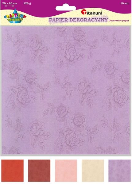 Papier dekoracyjny tłoczony struktura róże 20x20cm 120g 5 kolorów 10szt.Ozdobne, tłoczone papiery 120 g barwione w masie. Każde opakowanie zawiera 10 arkuszy w 5 kolorach (po 2 arkusze z koloru), kolory: czerwony, bordowy, brązowy, złoty, ecru. Struktura: róże, wymiar arkusza 20 x 20 cm. |