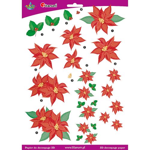 Papier do decoupage 3D kwiaty poinsecja 1 arkusz Papiery do dekoracji, ze wzorem 3D. Aby wykonać ozdobę z tego papieru, należy przygotować minimum 3 arkusze z tego samego wzoru. Technika ta polega na wytłaczaniu w papierze motywów, które mają być wypukłe i nakładaniu ich na siebie w odpowiedniej kolejności.... |