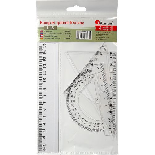 KOMPLET GEOMETRYCZNY 4EL 15CM- komplet czteroelementowy - transparentny - zawiera: linijkę 15 cm, 2 ekierki, kątomierz - pakowany w woreczek z zawieszką |