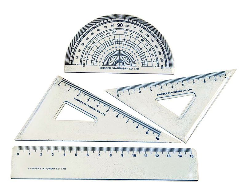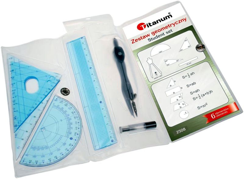 Komplet geometryczny 6 elementów w etui zawiera: linijkę 15cm, 2 ekierki 10cm, kątomierz, cyrkiel, grafit do cyrkla- zestaw geometryczny sześcioelementowy - w etui PCV - w zestawie: cyrkiel z rysikiem, linijka, kątomierz, 2 ekierki i zapas grafitów |