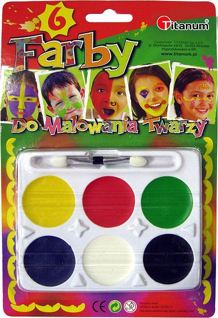 Farby do twarzy i ciała wodne 6 kolorów classicZestaw 6 farb do makijażu twarzy i ciała. Proste w użyciu, łatwo się rozprowadzają. Bezpieczne, na bazie wody - nie podrażniają skóry. Trwałe, nie rozmazują się. Świetnie sprawdzą się podczas imprez urodzinowych, karnawału czy dnia dziecka. Idealne... |