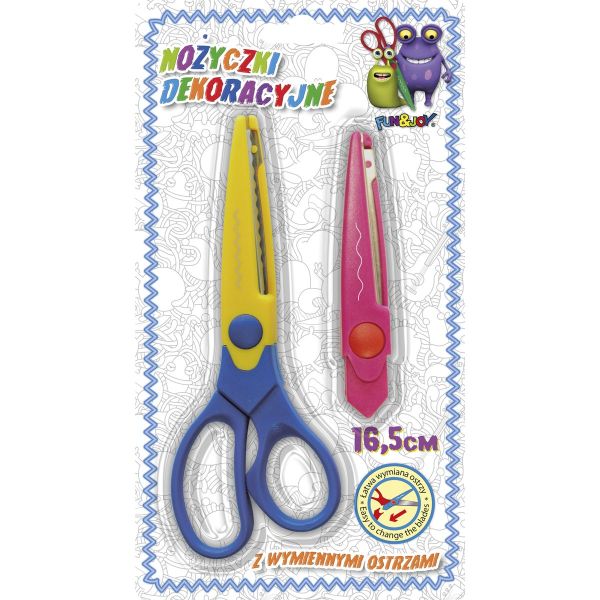 Nożyczki dekoracyjne 16, 5cm +1 ostrzeNożyczki dekoracyjne do wycinania fantazyjnych wzorów. Ostrza wykonane ze stali nierdzewnej a uchwyt nożyczek z mocnego, trwałego plastiku. Długość nożyczek: 16,5 cm. W komplecie nożyczki i 1 wymienne ostrze z innym wzorem cięcia. |