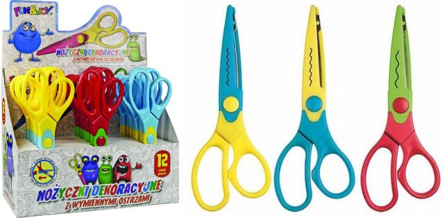 Nożyczki dekoracyjne 16, 5cm display 12 szt. 3 wzory cięciaNożyczki dekoracyjne do wycinania fantazyjnych wzorów. Najczęściej wykorzystywane przy pracach plastyczno-dekoracyjnych. W prosty i szybki sposób pozwalają na wycinanie atrakcyjnych wzorów, dzięki którym wykonać można niezwykłe laurki, bileciki, karnety,... |