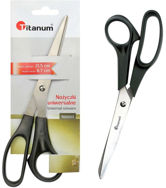 NOŻYCZKI S02023 CZARNE 21, 5CMdługość nożyczek 21,5 cm długość ostrza 8,7 cm regulowana śruba z nakładką plastikowy, wyprofilowany uchwyt w kolorze czarnym ostrze z nierdzewnej stali pakowane na blistrze |