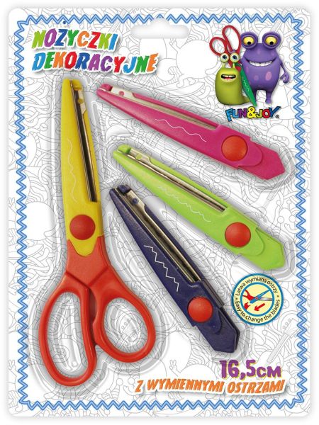 Nożyczki dekoracyjne 16, 5cm +3 ostrzaNożyczki dekoracyjne do wycinania fantazyjnych wzorów. Ostrza wykonane ze stali nierdzewnej w plastikowej obudowie w różnych kolorach, charakterystycznych dla danego wzoru cięcia, uchwyt nożyczek z mocnego, trwałego plastiku. Długość nożyczek: 16,5... |