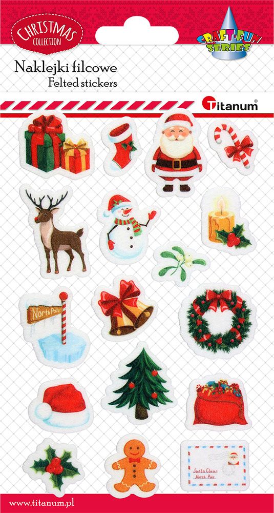 Naklejki filcowe Mikołaj, renifer, choinka, wianek, bałwanek, prezent, list, bombki mix 17szt.🎅 Naklejki filcowe Titanum Craft-Fun Series – Świąteczne wzory mix 16szt.