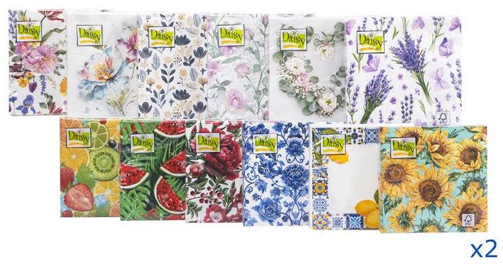 Różnorodne serwetki papierowe z nadrukiem Daisy to eleganckie i praktyczne serwetki dekoracyjne na każdą okazję – do restauracji, hotelu czy domu. W kartonie znajduje się 12 wzorów po 2 paczki, razem 24 paczki serwetek. Producent serwetek dekoracyjnych...