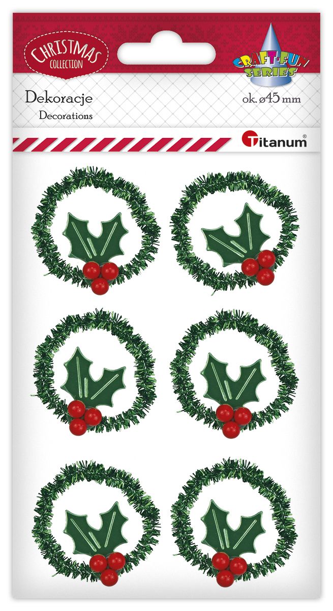 Wianki Ook.40mm z drucika dekoracyjnego zielone z ostrokrzewem 6szt. (na druciku)🌿 Dekoracje świąteczne Titanum Craft-Fun Series – Wianki z ostrokrzewem 6szt.