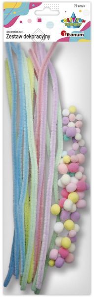 Zestaw: druciki 30cm x15szt., pompony mix rozmiarów x60szt. 75szt. pastelowy TITWLK26 |