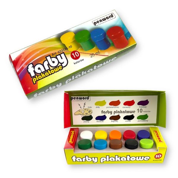 FARBY PLAKATOWE MF923335-10 10 KOL. (SZPSH)wydajne farby wodne idealnie kryjące żywe i czyste barwy komplet 10 kolorów pojemność kubeczka 20 ml wodorozcieńczalne gęsta konsystencja umożliwia wykonywanie prac plastycznych wieloma technikami po wyschnięciu farby są matowe,... |