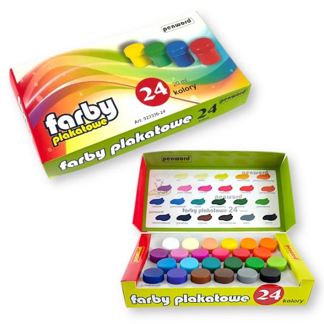 FARBY PLAKATOWE MF923336-24 24 KOL. (SZPSH)wydajne farby wodne idealnie kryjące żywe i czyste barwy komplet 24 kolorów pojemność kubeczka 20 ml wodorozcieńczalne gęsta konsystencja umożliwia wykonywanie prac plastycznych wieloma technikami po wyschnięciu farby są matowe,... |