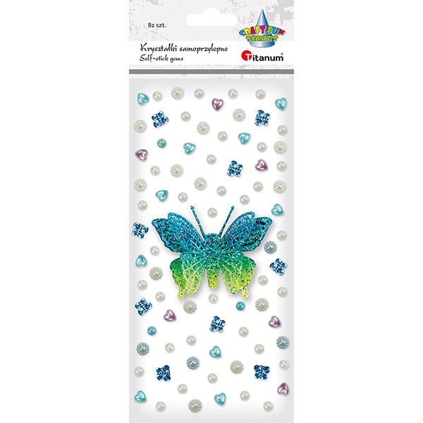 Kryształki samoprzylepne motyl 3D 75x60mm, motyle akrylowe 10x8mm, kwiatki O7mm, perełki serca 8x8mm, perełki O5, 5mm turkusowe, błękitne, różowe, bia |