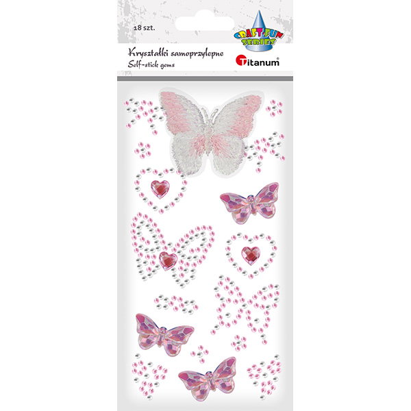 Kryształki samoprzylepne motyle mix (w tym z kryształków 45x37/35x33mm, akrylowe 32x18mm, z muliny na tkaninie 54x45mm, serca 27x25mm) różowe 18szt. |