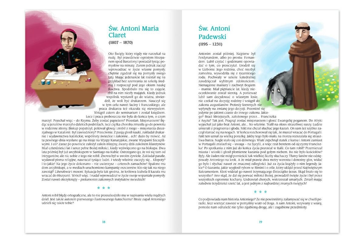 Ależ tam w niebie musi być ciekawie! No bo pomyśl tylko: wszyscy są tam już wprawdzie świętymi, ale każdy doszedł do tej świętości całkiem inną drogą. Jest więc wśród nich i dawny łotr Dyzma, i uwikłany w astrologię Augustyn, były satanista Bartłomiej Longo i zatracający się w polowaniach Hubert. Święci i Błogosławieni: Św. Adelajda Św. Agata Św. Albert Chmielowski Św. Aleksandra Św. Alfons Liguori Św. Alfons Rodriguez Św. Alojzy Gonzaga Św. Alojzy Orione Św. Andrzej Bobola Św. Andrzej Dung-Lac Św. Andrzej Świerad Św. Aniela Merici Św. Antoni Maria Claret Św. Antoni Padewski Bł. Annuarita Św. Apolonia Św. Arnold Janssen Św. Augustyn Św. Augustyn Zhao Rong Bł. Bartłomiej Longo Św. Benedykt z Nursji Św. Bernadetta Soubirous Św. Bernard z Clairvaux Św. Błażej Bł. Bolesława Lament Św. Bonawentura Św. Brunon z Kartuz Św. Brygida Św. Cecylia Św. Cyryl i św. Metody Św. Damian i św. Kosma Św. Dominik Guzman Św. Dominik Opancerzony Św. Dominik Savio Św. Dorota Bł. Dorota z Mątowów Św. Dyzma Św. Edmund Campion Św. Elżbieta Portugalska Św. Emilia de Vialar Św. Faustyna Kowalska Św. Feliks z Kantalicjo Św. Filip Nereusz (Neri) Św. Florian Św. Franciszek Ksawery Bł. Franciszek Palau y Quer Św. Franciszek Salezy Św. Franciszek z Asyżu Św. Franciszka Ksawera Cabrini Św. Gemma Galgani Św. Genowefa Św. Gerard Majella Św. Gertruda Św. Grzegorz Wielki Św. Helena Św. Hiacynta Marescotti Św. Hieronim Św. Hilary z Poitiers Św. Hildegarda z Bingen Bł. Honorat Koźmiński Św. Hubert Bł. Ignacy Kłopotowski Św. Ignacy Loyola Bł. Imelda Lambertini Św. Izydor Bł. Izydor Bakanja Św. Jacek Odrowąż Św. Jadwiga królowa Bł. Jan Beyzym Św. Jan Bosko Św. Jan Boży Św. Jan Chryzostom Św. Jan de Brébeuf Św. Jan Gwalbert Św. Jan od Krzyża Bł. Jan Paweł II Św. Jan Sarkander Św. Jan Vianey Św. Jan z Dukli Św. Jerzy Bł. Jerzy Popiełuszko Św. Joanna Beretta Molla Św. Joanna d’ Arc Św. Joanna de Valois Św. Joanna Franciszka de Chantal Św. Józef Kalasancjusz Św. Józef Pignatelli Św. Józefina Bakhita Św. Juan Diego Św. Julia Billiart Św. Kajetan Św. Kamil de Lellis Św. Karol Boromeusz Bł. Karol de Foucauld Św. Karol Lwanga Bł. Karolina Kózkówna Bł. Katarzyna Emmerich Św. Katarzyna Labouré Św. Katarzyna Tekakwitha Św. Katarzyna ze Sieny Św. Kinga Św. Klara Bł. Klara Badano Św. Klaudiusz de Colombière Św. Klemens Hofbauer Św. Koleta Św. Konrad Confalonieri Św. Krystyna z Bolseny Św. Krzysztof Magallanes Bł. Laura Vicuna Św. Ludmiła Św. Ludwik Grignion de Montfort Św. Ludwika de Marillac Św. Maksymilian Maria Kolbe Św. Małgorzata Alacoque Św. Małgorzata Szkocka Św. Małgorzata Ward Św. Małgorzata z Kortony Św. Marcin de Porres Św. Marcin z Tours Św. Maria Goretti Sł. Boży Mateusz Talbot Św. Mikołaj z Miry Św. Monika Św. Natalia Św. Olaf Św. Patryk Św. Paula Montal Św. Paweł Chong Ha-sang Św. Pio Św. Piotr Chanel Bł. Piotr Jerzy Frassati Św. Piotr Klawer Bł. Rafał Chyliński Św. Rafał Kalinowski Św. Rajmund Nonnat Św. Rita Św. Roch Św. Róża z Limy Św. Sarbeliusz [Charbel] Makhlouf Św. Scholastyka Św. Stanisław Kostka Sł. Boża Stanisława Leszczyńska Św. Szymon z Lipnicy Św. Teresa Benedykta od Krzyża (Edyta Stein) Św. Teresa z Avili Bł. Teresa z Kalkuty Św. Teresa z Lisieux Św. Tomasz Becket Św. Tomasz z Akwinu Św. Urszula Ledóchowska Św. Walenty Św. Wawrzyniec Ruiz Św. Wawrzyniec Wang Bing Św. Weronika Giuliani Św. Wincenty à Paulo Bł. Władysław z Gielniowa Św. Wojciech [Adalbert] Św. Zofia Św. Zygmunt Szczęsny Feliński
