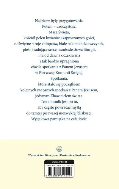 Ten uroczy album to wzruszająca pamiątka Pierwszej Komunii Świętej, która pozwoli dziecku powracać myślą do jednego z najważniejszych duchowych momentów życia. Ilustrowana publikacja zachwyca elegancją i subtelną oprawą, a każda strona przypomina o głębi spotkania z Panem Jezusem.